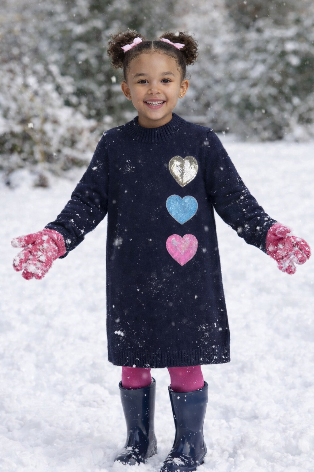 - Knitted dress, long sleeves, round neckline, hearts in sequins and loop stitch on the side, label.