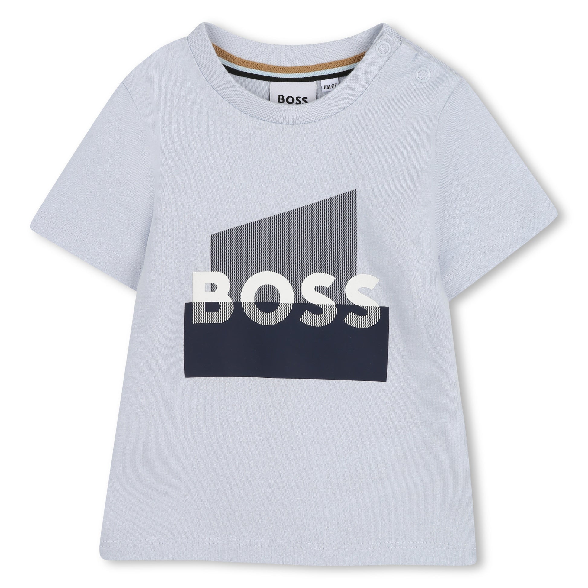 - Short-sleeved cotton jersey T-shirt with BOSS graphic centered at chest. Press stud fastening at shoulder.