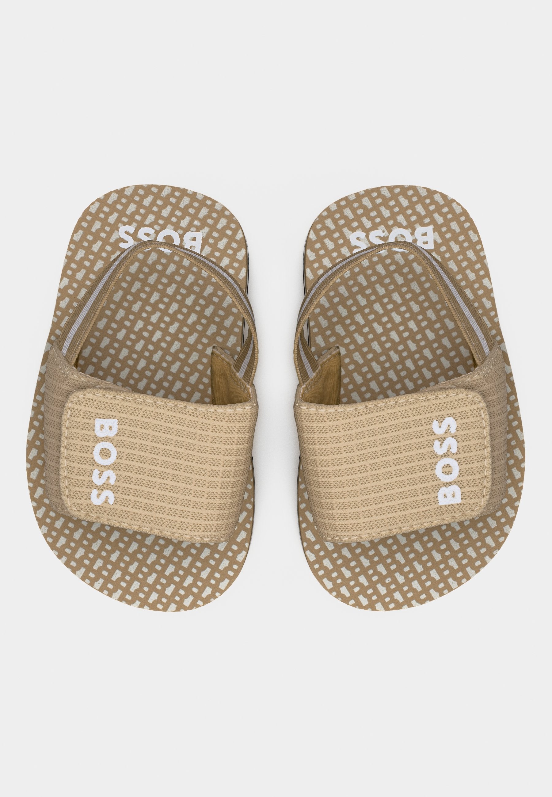 - Sandals with hook and loop closure and elastic ankle strap. Brand printed at front. Upper and lining in textile matérial. Outsole in EVA. SOLD WITH ONE HANGER.