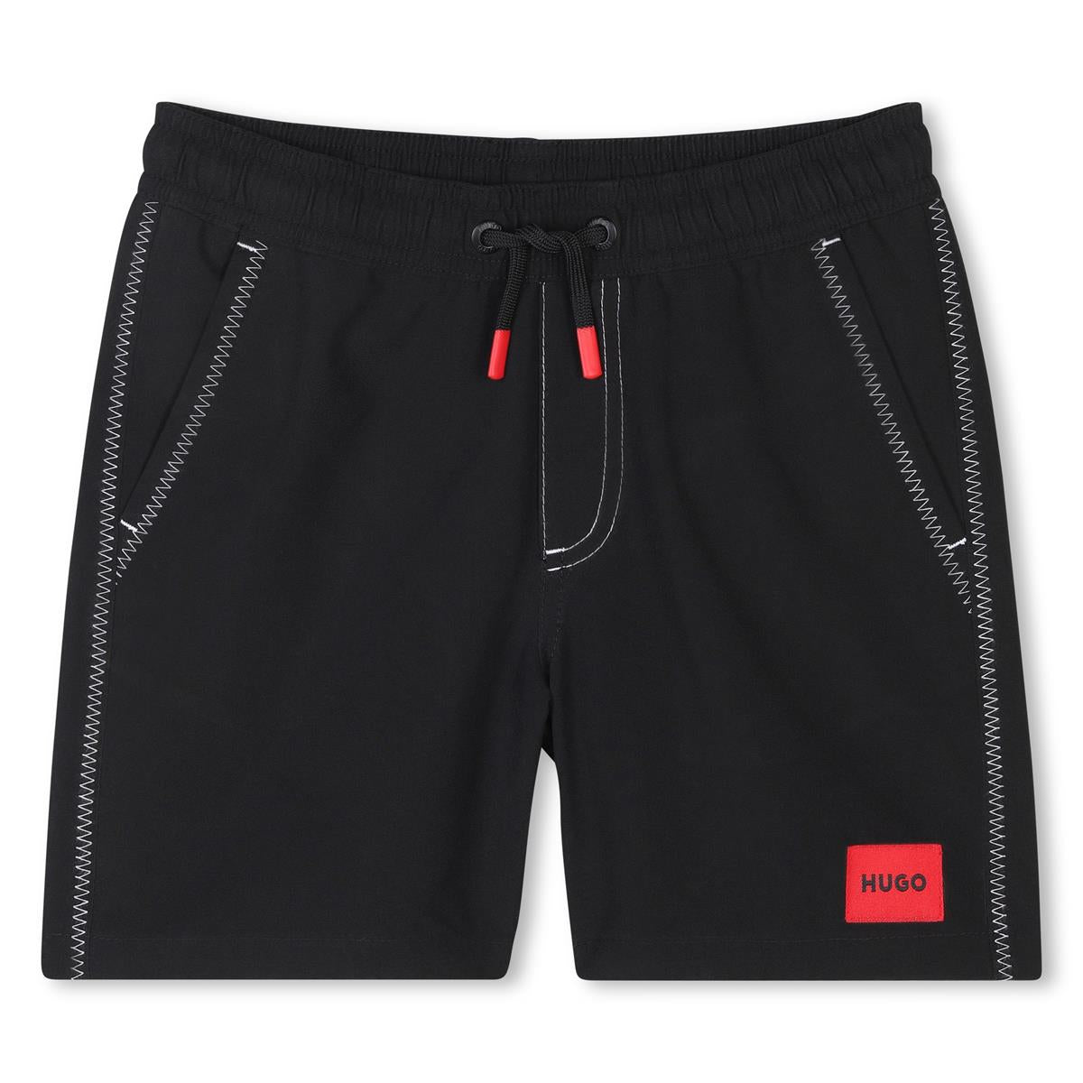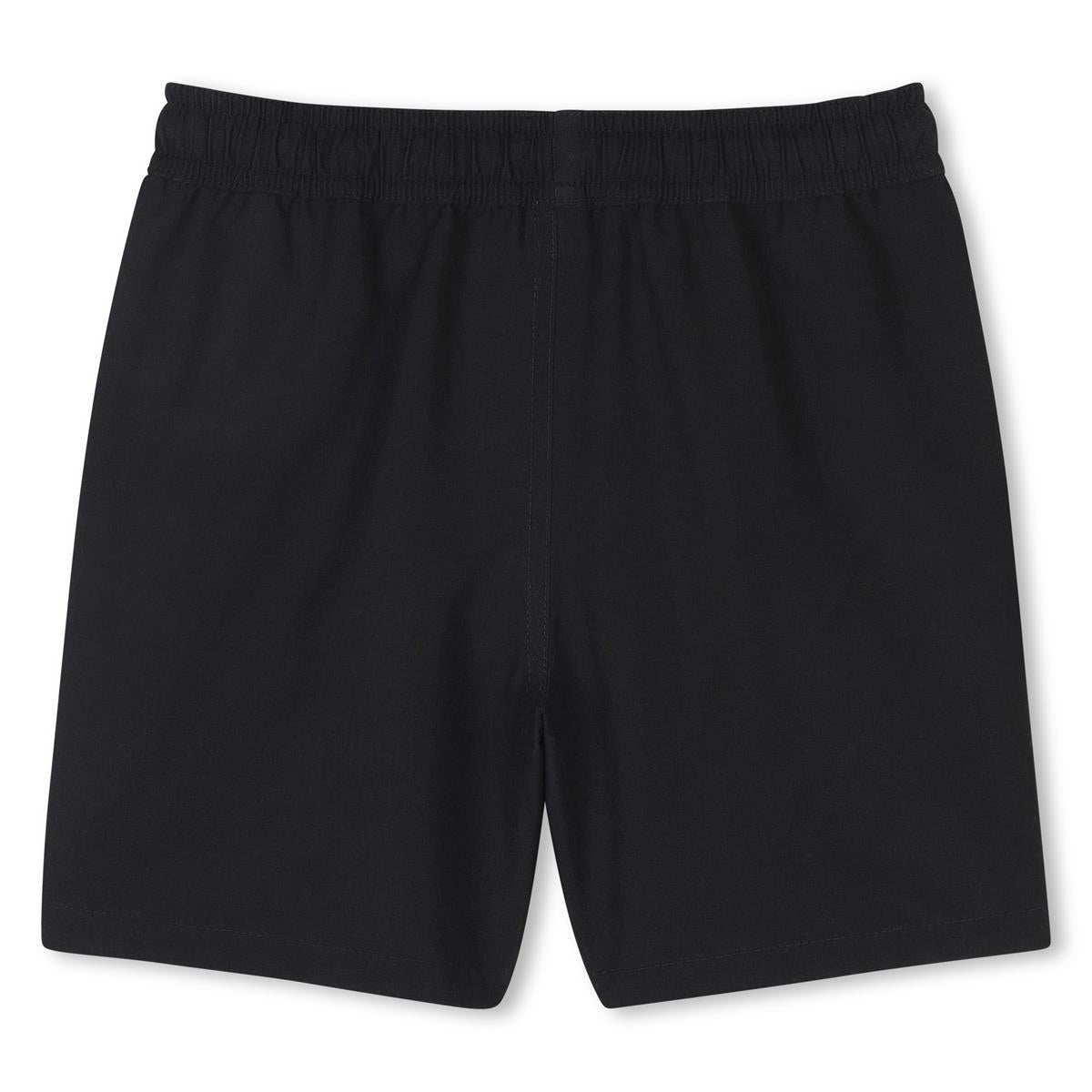 - Polyester surfer with sides pockets, contrasted stitchings, elasticated waistband, drawstrings with rubber ends, branded woven label at the bottom leg.