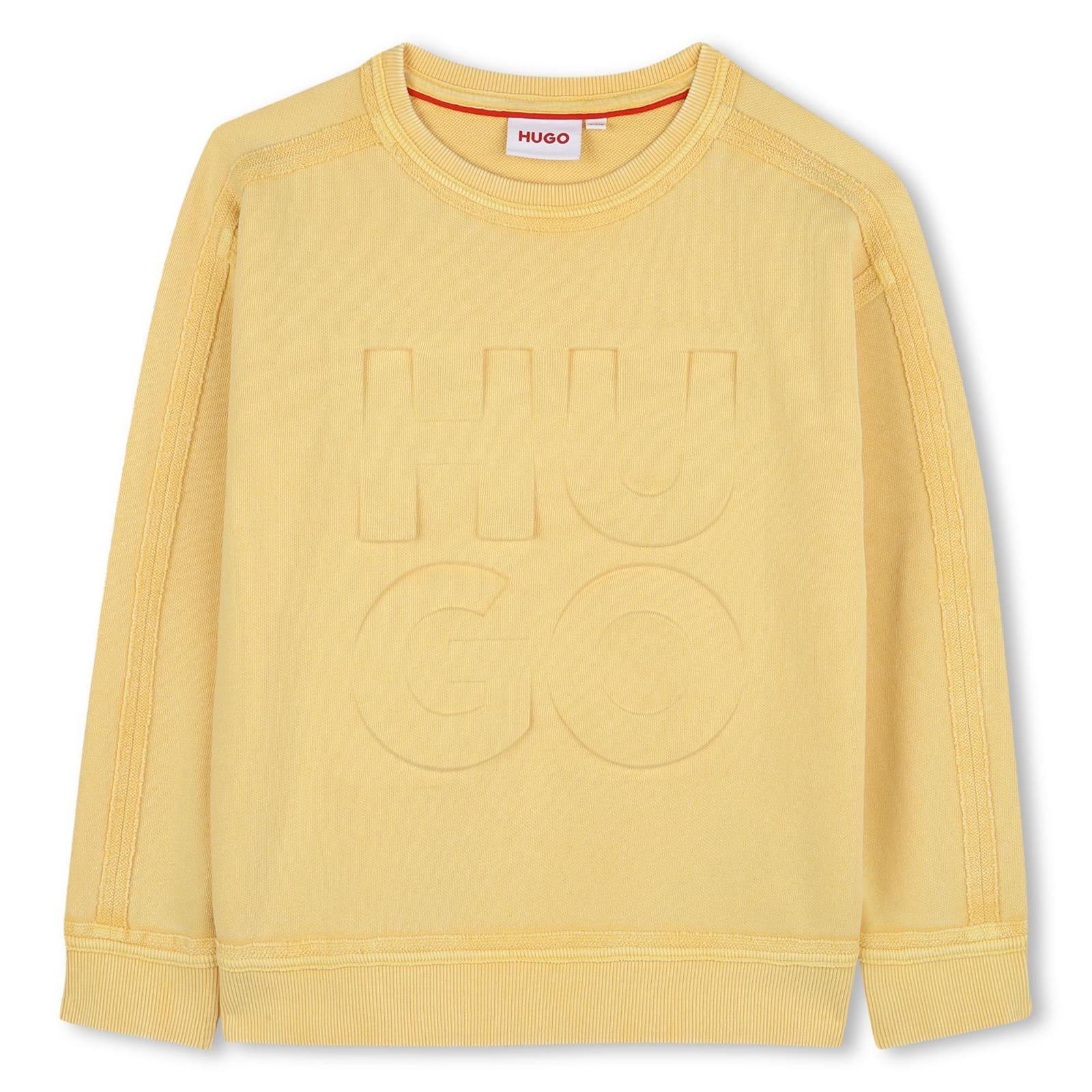 - 80% cotton / 20% polyester washed French terry crew neck sweat-shirt, embossed "HUGO" logo on the front, rib on collar, cuffs, and bottom.