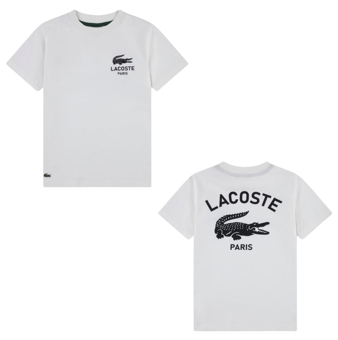 White t-shirt for boys by Lacoste. Made from soft organic cotton jersey, it features the brands signature crocodile logo print and badge on the front.