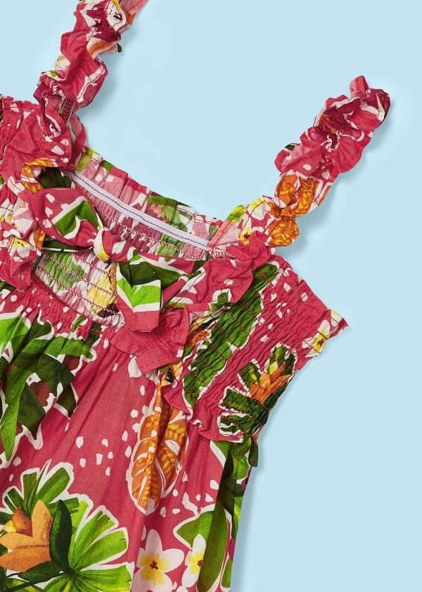 A red dress for girls by Mayoral, made in soft and lightweight cotton voile. It has a vibrant tropical palm tree and toucan pattern with ruffled elasticated straps and a stylish shirred bodice. A matching headband with a bow finishes this pretty outfit.