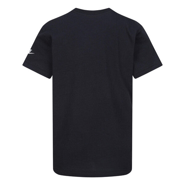 Black T-shirt for boys and girls by Nike Kids. Made from soft cotton jersey, it features the brands white logo print on the front and on one sleeve.
