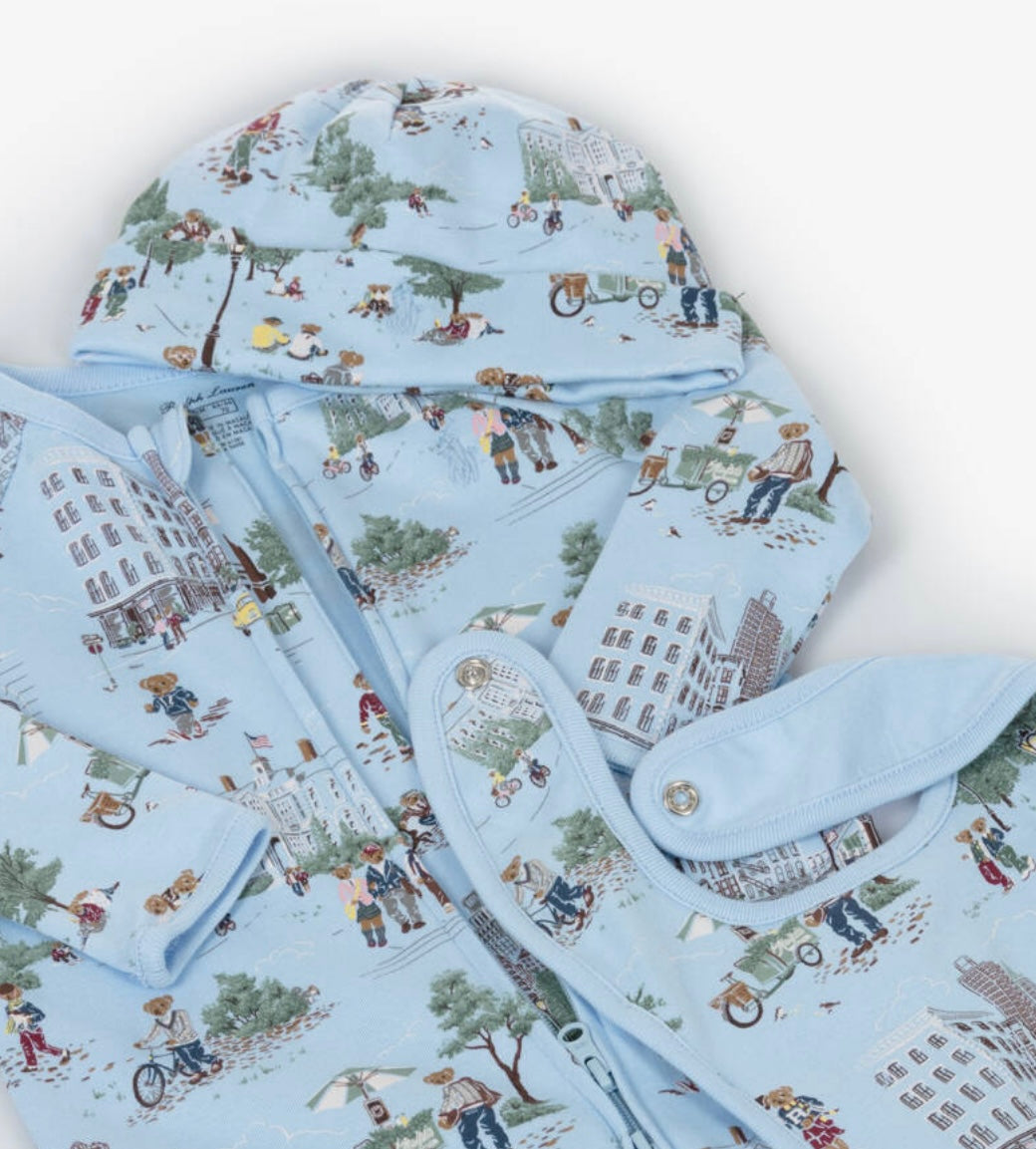 This adorable pale blue babysuit set for boys by Ralph Lauren, features the brand's iconic Polo Bear exploring the sights of New York City. Made in soft cotton jersey, the set includes a babygrow with a convenient two-way zip fastening for easy dressing, a hat with a cute turned-up brim and a jersey-lined bib, fastened with a single popper. Presented in a box, this stylish set makes a lovely gift for a special new arrival.