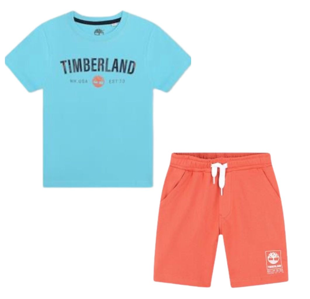 Designed by Timberland, this Aqua short-sleeved T-shirt for boys is made in soft organic cotton jersey. Casual and crew neck, it has a cool camouflage logo appliqué on the front. The signature tree logo is printed beneath Coral for extra branded appeal.